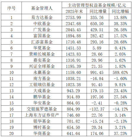 Wind数据显示,截至2025年末,广发基金主动管理型权益产品规模达2045.45亿元,行业排名第三,同比增长26.58%。但中欧基金同比增长38.33%至2347.68亿元,已超越广发基金排名第二;易方达基金以2753.99亿元排名第一,同比增长13.88%。